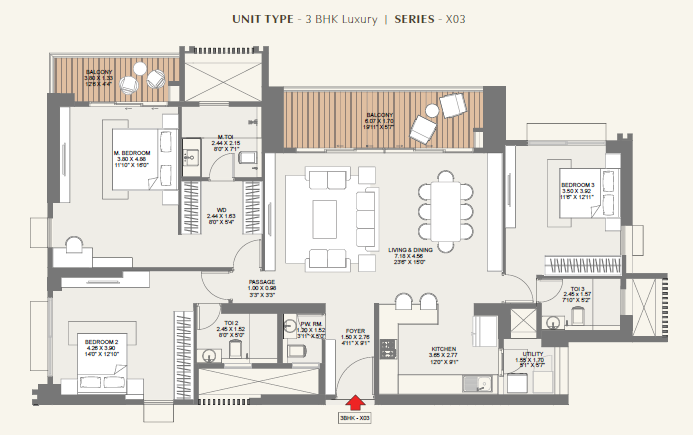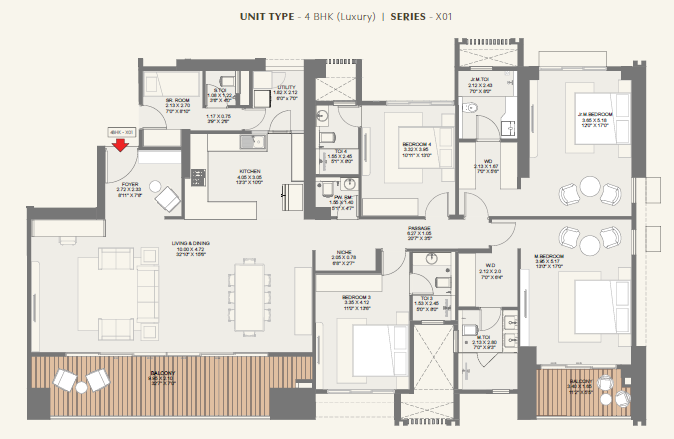 Designed with only four expansive residences per floor across signature 3B + G + 15-storey towers, the development ensures unparalleled privacy, abundant natural light, and cross-ventilation that enhances everyday comfort. Each home is thoughtfully planned with grand living spaces, dual private balconies, dedicated utility areas, and refined detailing that reflects sophistication at every corner.
